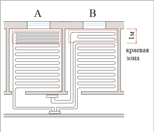 В случае, когда напольное отопление не может полностью восполнить теплопотери помещения, можно попытаться компенсировать недостачу тепловой энергии устройством краевых зон. Краевые зоны – это участки тёплого пола с повышенной температурой поверхности пола, которые устраивают, как правило, вдоль наружных стен на ширину не более 1 м.