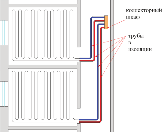 Площадь пола, обслуживаемая одной петлёй, зависит от принятого шага труб и в квадратных метрах примерно равна шагу труб, выраженному в сантиметрах. То есть, при шаге труб 15 см площадь обслуживаемого пола составляет ориентировочно 15 м2. Подводящие участки труб от коллектора до обслуживаемого петлёй помещения следует теплоизолировать с помощью теплоизоляции для труб или гофрокожуха (рис. 4).
