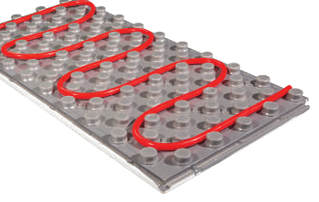 Специально для устройства водяных тёплых полов выпускаются теплоизоляционные плиты с выступами для фиксации труб тёплого пола. Соединение плит между собой может выполняться по-разному. Например, в плитах «Экопол 20» соединение плит обеспечивается «пристёгиванием» выпуска покровного полистирольного слоя на соседнюю плиту (рис. 8).