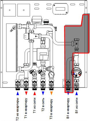 - холодная вода на входе в станцию разделяется на два потока, один идет на нужды квартиры в холодной воде, а второй – в теплообменник для последующего нагрева;