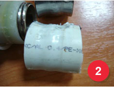 Комиссия обследовала состояние всех элементов системы ГВС жилого дома, включая индивидуальный тепловой пункт, идентифицировала типы и марки материалов и изделий используемых в ходе ремонта стояков ГВС. Было выявлено, что наряду с изделиями торговой марки Valtec на объекте использовались пресс-фитинги Comisa (Италия), Smart (Китай), металлопластиковые трубы Henco (Бельгия) и МПТ трубы неизвестного производителя с маркировкой, аналогичной Henco. Именно отрезок этой поддельной трубы и оказался в аварийном узле. Лабораторные исследования слоев трубы «псевдо- Henco», включающие в себя определение степени сшивки по методике ТУ 2248-096-00284581-2005, показали, что наружный и внутренний слои выполнены из обычного полиэтилена низкого давления (PEHD), что не допускает использование таких труб для систем трубопроводов с температурой транспортируемой среды свыше 40°С. В оригинальной трубе Henco наружный и внутренний слои выполнены из сшитого полиэтилена PEX-c. На фотографии термического испытания кольцевого образца исследуемой трубы в муфельной печи при температуре 131°С видно, во что превратился полиэтилен (рис.1).