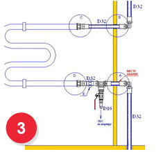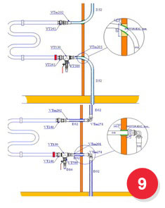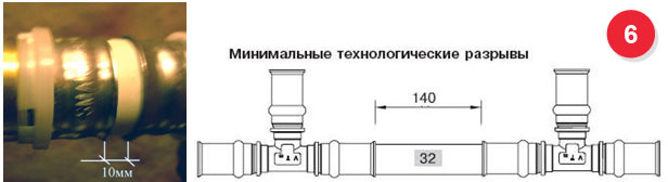 При выполнении узла E (рис.3) нарушены рекомендации производителя по соблюдению минимально допустимого расстояния между соседними пресс-фитингами. Согласно требованиям «Пособия по проектированию и монтажу трубопроводных систем с использованием металлопластиковых труб», минимальное расстояние между гильзами соединителей для трубы Дн32 составляет 140мм. Соединения в узле Е смонтированы с зазором всего 10 мм (рис. 6).