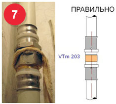 Кроме указанных недостатков монтажа, в смонтированной системе жилого дома были обнаружены монтажные стыки стояков, в которых вместо прямых пресс-соединителей использованы соединители с переходом на резьбу. Как видно на рис. 7, устранить течь в таком соединении уже невозможно.