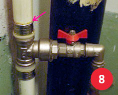 Стояки холодного водоснабжения на обследуемом объекте смонтированы без единой опоры. При стальных трубопроводах, компенсаторы на таких стояках не нужны, но при переходе на металлопластиковые трубы следует учитывать, что подаваемая холодная вода с зимней температурой +5°С за ночь, при отсутствии водоразбора, может нагреться до 20°С, что приведет к температурному удлинению трубы по 1,1мм на этаж, что в целом по стояку для 9-ти этажного дома составит почти 10 мм. Решения по компенсации этих деформаций монтажниками также учтены не были. В результате на стояках холодного водоснабжения также обнаружены места, где видны следы «сползания» пресс-гильзы с трубы (см. рис. 8)