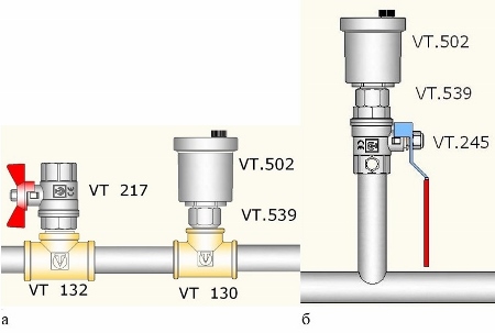 - при заполнении системы теплоносителем не допускается использование для выпуска воздуха автоматических воздухоотводчиков (они должны быть закрыты). Выпуск воздуха из системы должно осуществляться через предусмотренные для этого штуцеры с кранами (рис. 2а) или комбинированные краны с дренажом и ручным воздухоотводчиком (рис. 2б);