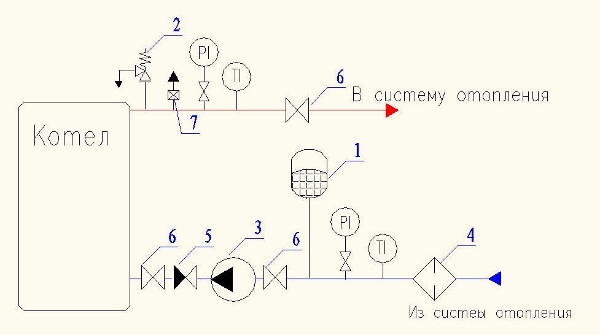 Рис. 4. Установка расширительного бака в системе с одним котлом: 1 – расширительный бак; 2 – предохранительный клапан; 3 – циркуляционный насос; 4 – фильтр; 5 – обратный клапан; 6 – запорный кран; 7 – воздухоотводчик
