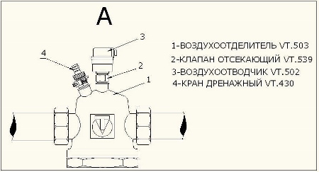 Если грамотно подойти к решению этого вопроса, то ничего страшного не произойдет. Циркуляционное давление если и снизится, то на ничтожно малую величину (несколько паскалей), за счет паразитного влияния остывающего в верхнем розливе теплоносителя. Воздух из системы придется удалять с помощью проточного воздухосборника и воздухоотводчика. Пример этого устройства показан на рис. 4. Дренажный кран служит для выпуска воздуха в момент заполнения системы теплоносителем. В «крейсерском» режиме этот кран закрыт. Такая система останется полностью работоспособной.