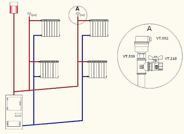 Миф 3. В гравитационных системах подающий трубопровод должен проходить над всеми ярусами радиаторов. Это тоже совсем не обязательно. Расположение подающего трубопровода с надлежащим уклоном под потолком верхнего этажа или на чердаке позволяет удалять воздух из системы через открытый расширительный бак. Однако проблему удаления воздуха можно решить и с помощью автоматических воздухоотводчиков (рис. 6) или отдельной воздушной линии.Рис. 6. Схема с нижним расположением подающей линии