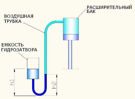 Миф 6. В открытый расширительный бак необходимо постоянно доливать теплоноситель, т.к. он интенсивно испаряется. Да, это действительно большое неудобство, но его можно легко устранить. Для этого используется воздушная трубка и гидравлический затвор, устанавливаемый, как правило, ближе к нижней точке системы, рядом с котлом (рис. 8). Такая трубка служит воздушным демпфером между гидравлическим затвором и уровнем теплоносителя в баке, поэтому, чем больше ее диаметр, тем лучше. Тем меньше будет уровень колебаний уровня в бачке гидрозатвора. Некоторые умельцы умудряются закачивать в воздушную трубку азот или инертные газы, тем самым предохраняя систему от проникновения кислорода.