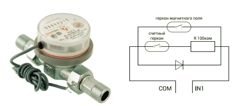 Например, водосчетчики VALTEC VLF-IС с импульсным выходом и формирователем сигнала о воздействии магнитного поля (рис. 2). Эти счетчики имеют два геркона (геркон – пара ферромагнитных контактов). Первый геркон служит для передачи в систему сбора данных информации о количестве воды, потребленной жителями квартиры. Второй геркон отвечает за индикацию и передачу в сеть сигнала, возникающего при воздействии на счетчик магнитного поля (рис. 3).
