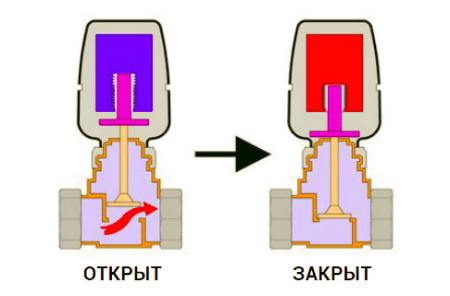 Эти клапаны управляются термочувствительным элементом (термоголовкой), внутри которого находится сильфонная ёмкость, заполненная рабочим телом (газ, жидкость, твёрдое вещество) с высоким коэффициентом объемного расширения. При изменении температуры воздуха, окружающего сильфон, рабочее тело расширяется или сжимается, деформируя сильфон, который, в свою очередь, воздействует на шток клапана, открывая или закрывая его (рис. 1).