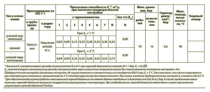 На рис. 10 представлен фрагмент из технического описания одного из типов термостатических клапанов. В основной графе указано значение максимального перепада давления 0,6 бара (60 кПа). Однако в сноске есть примечание, что действительный диапазон работы клапана ограничен всего лишь 0,2 барами (20 кПа).