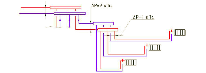 В этом случае регулятор перепада давления можно расположить перед этажным коллектором и настроить его на перепад 15 кПа. Такая схема позволяет сократить количество регуляторов перепада давления и существенно удешевить систему.