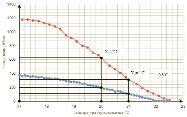 Как видно на графике, клапан закрывается при температуре 22 ˚С. При понижении температуры воздуха, пропускная способность клапана увеличивается. На графике показаны значения расхода воды через клапан при температуре 21 (S – 1) и 22 (S – 2) ˚С.