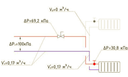 Если принять во внимание, что перепад давления поддерживается постоянным (равным 100 кПа), то можно определить расход, который установится в системе после отключения одного из радиаторов.