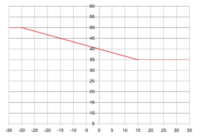 Для построения более сложного графика потребуется как минимум две точки. К примеру, отопительный график на рис. 1 задан двумя точками: первая (–30 °C; +50 °C), вторая (+15 °C; +35 °C). Точка № 1 (–30 °C; +50 °C): при наружной температуре –30 °С и ниже, температура теплоносителя подаваемого в систему отопления будет равна +50 °С. Вторая точка (+15 °C; +35 °C): при наружной температуре +15 °С и выше, температура теплоносителя подаваемого в систему отопления будет равна +35 °С. В данном случае график будет иметь вид наклонной прямой между этими точками, где каждой температуре уличного воздуха будет соответствовать своя температура теплоносителя.