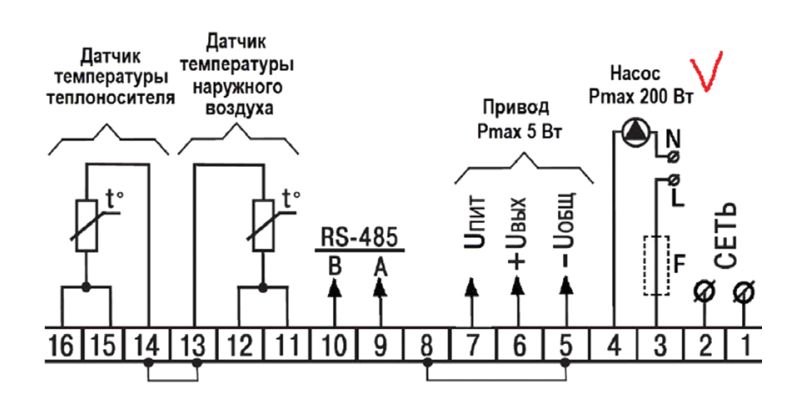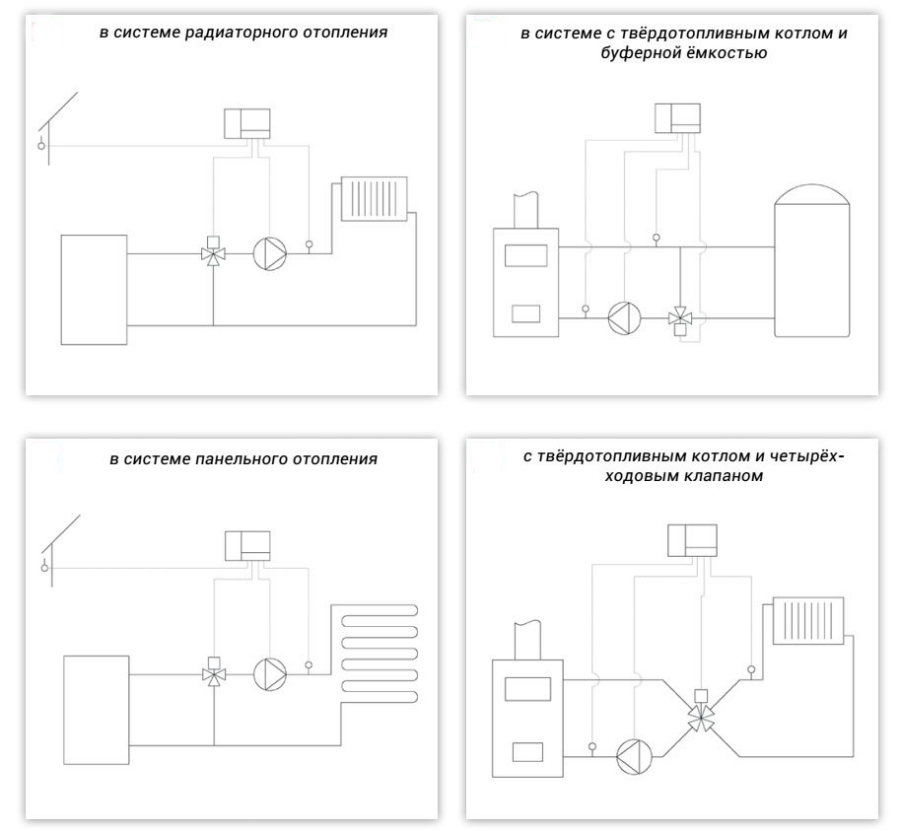 Основной функцией контроллера является управление насосом и исполнительным устройством (сервопривод) смесительных узлов систем отопления с целью поддержания температуры теплоносителя на выходе.