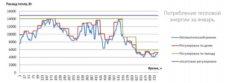 Как видно из приведенной таблицы, режим работы, при котором отсутствует регулировка, принят за 100 %. Экономия при полностью автоматическом режиме составила 64,4 %. Необходимо отметить, что увеличение экономического эффекта будет осуществляться за счет использования, к примеру, режима работы по периодам присутствия/отсутствия жильцов, которые настраиваются индивидуально.