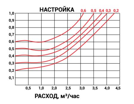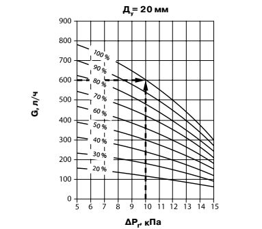 Если рассмотреть график (рис. 3), то можно обнаружить, что данный регулятор при настройке на 50 % будет поддерживать перепад давления 10 кПа при расходе 300 л/ч.