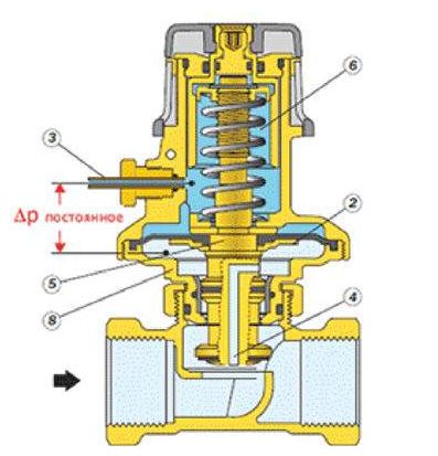 При увеличении перепада давления клапан начинает прикрывать поток, а при уменьшении – приоткрывать поток теплоносителя.