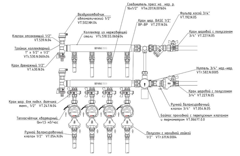Рис. 9. Этажный коллекторный узел с перепускным клапаном