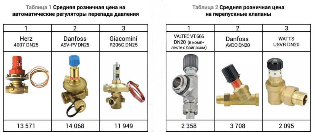 В таблице 1 представлены марки наиболее распространенных на российском рынке автоматических регуляторов перепада давления DN25 и их розничная стоимость. В таблице 2 приведены данные о некоторых перепускных клапанах DN20 (перепускные клапаны DN20 в большинстве случаев имеют рабочий диапазон расходов такой же, как автоматические регуляторы перепада давления DN25).