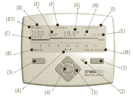 Рис. 1. Устройства управления и поля дисплея программатора EQUICALOR: 1, 5 – многофункциональные кнопки (правая, левая); 2 – кнопка сброса настроек; 3 – стрелки для навигации; 4 – кнопка «OK-Режим»; A – иконка навигационных стрелок; B – поле левой многофункциональной кнопки (Меню/Выход/Отмена); С – 7-дневный график расписания с интервалами Т1, Т2, Т3, (температура комфорта, энергосбережения, антизамерзания соответственно ); D – активированный режим; D1 – действующий временной режим; E – заданная температура; F – выбранная на данный момент зона; G – cчитанная температура; H – напоминание о сигналах тревоги; I, L – дата и время; M – поле правой многофункциональной кнопки (Ввод/Изменить/Выбор/Просмотр/Время).