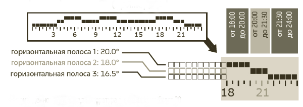 Суточный график отображается на дисплее программатора в виде горизонтальных полос (рис. 2). В приведенном примере с 18 до 20 ч в помещении будет поддерживаться температура 20, с 20 до 21 ч 30 мин – 18, с 21 ч 30 мин до 24 ч – 16,5 °C. Такие программы задаются индивидуально для установленных зон обслуживаемого здания (до восьми зон на программатор).