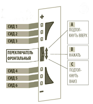 Органами управления радиосервопривода VT.AS1000 являются трехпозиционный переключатель, а также шесть светодиодных индикаторов СИД (рис. 3), с помощью которых производится настройка прибора, контроль его работы.