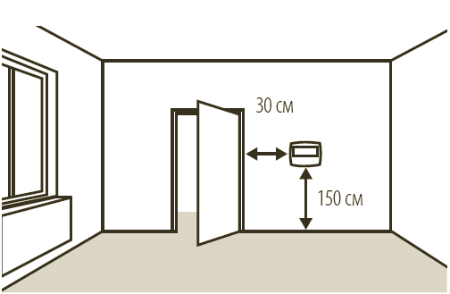 Место для установки хронотермостата также следует выбирать с учетом того, что данный прибор измеряет температуру воздуха помещении. Чтобы на показания встроенного сенсора не влияли внешние факторы, программатор не следует устанавливать вблизи радиаторов, дверных проемов (рекомендуемое расстояние – не менее 30 см), в местах прохода внутри стен трубопроводов, воздействия прямого солнечного света, на внешних стенах, в помещениях с нестандартными температурой и влажностью (кухня и ванная и т.д.). В месте размещения модуля VT.DC1000 должна быть хорошая циркуляция воздуха. Рекомендуемая высота установки – 1,5 м от пола (рис. 7).