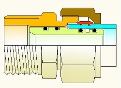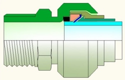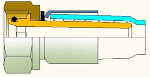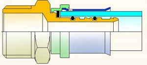Принцип работы обжимного соединителя VTm.300 заключается в создании зоны обжатия за счет смыкания обжимного латунного разрезного кольца («сухаря»). Смыкание происходит при воздействии на «сухарь» конусных поверхностей накидной гайки и штуцера фитинга во время затяжки накидной гайки (рис. 8).