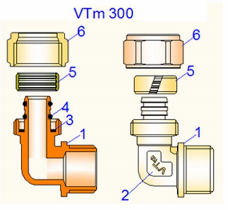 Для соединения труб VALTEC разработаны две серии фитингов: обжимные – VTm.300 – и пресс-фитинги – VTm.200. Литера «m» в маркировке соединителей – типовое окончание марки фитингов для металлополимерных труб, от итальянского слова «multistratо» (многослойная).