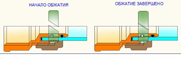 В процессе опрессовки происходит деформация стенок трубы, внутренний слой частично вдавливается в проточки штуцера, создавая прочное, герметичное соединение, защищенное от сползания.