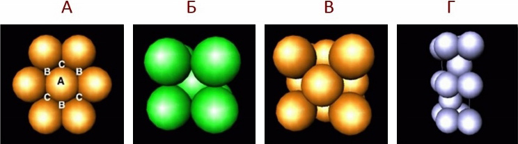 Каждое фазовое состояния характеризуется своей электронно-кристаллической решеткой. Характерная для чистой меди кубическая плотноупакованная (КПУ) решетка (рис. 1, А) обуславливает мягкость и ковкость материала. В латуни такая же решетка обнаруживается в -фазе. Для чистого цинка присуща гексагональная плотноупакованная (ГПУ) решетка (рис. 1, Г), придающая материалу твердость и хрупкость. Этим характеризуется -стадия латуни. Кубическая объемно-центрическая решетка (ОЦК), рис. 1, Б, и кубическая гране-центрическая решетка (ГЦК), рис. 1, В, соответствуют β- и γ-фазам латуни.