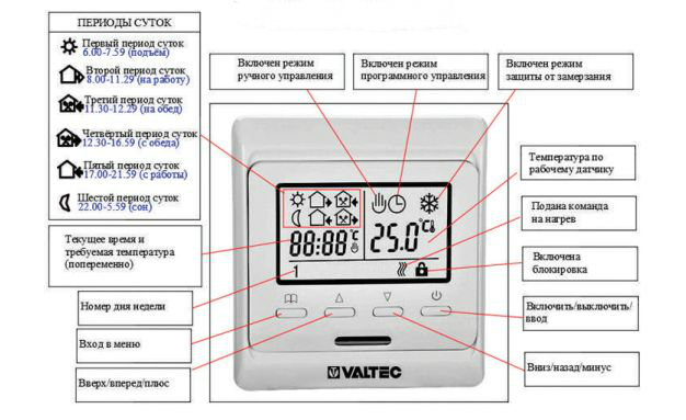 Хронотермостат позволяет программно задавать режимы отопления в разное время рабочих суток и выходных дней. Для этого каждые сутки условно делятся на 6 периодов, время начала каждого из которых задаётся пользователем. То есть, при 5-дневной рабочей неделе надо запрограммировать 6 периодов для пяти суток (рабочих) и 2 х 6=12 периодов для выходных дней. Для каждого из назначенных периодов задаётся требуемая температура воздуха или пола (при назначении в качестве рабочего выносного датчика).