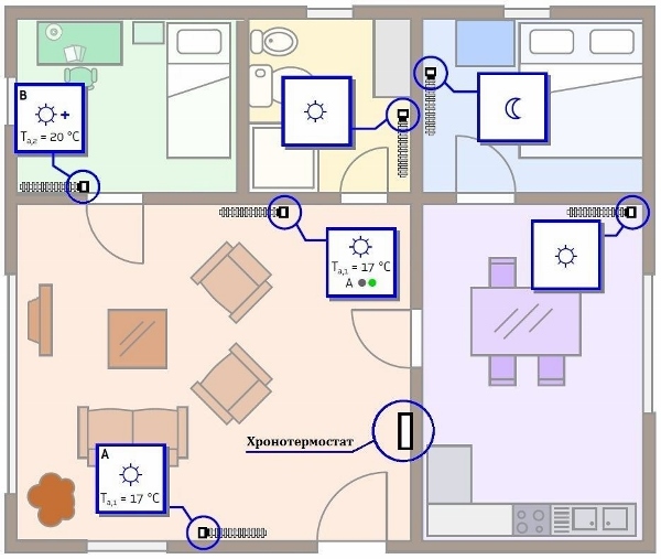 Головной хронотермостат оснащен встроенным датчиком температуры. В процессе работы устройство сравнивает показания температуры встроенного датчика с температурой, измеренной у отопительного прибора в том же помещении (привод «А», рис. 2) и вносит пропорциональную поправку в работу всех остальных радиосервоприводов. Такой алгоритм автоподстройки позволяет исключить значительные влияния воздушных конвективных потоков у отопительного прибора на датчик температуры радиосервопривода.