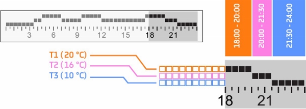 В примере, приведенном на рис. 7, отображена настройка, при которой в период времени 18:00–20:00 будет поддерживаться комфортный режим с ранее предустановленной температурой 20 °C; с 20:00 до 21:30 – режим энергосбережения с температурой 16 °С и с 21:30 до 24:00 – режим антизамерзания с температурой 10 °С.