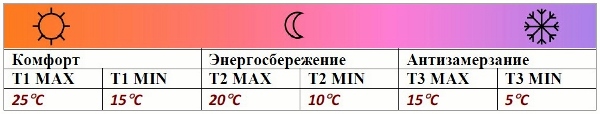 Регулирование осуществляется по трем ранее запрограммированным пользователем режимам: «Комфорт», «Энергосбережение» и «Антизамерзание». Для каждого из режимов задается требуемая температура воздуха в помещении в пределах температур, указанных в таблице.