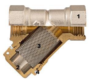 Все модели косых фильтров VALTEC могут использоваться в трубопроводных системах с максимальной температурой рабочей среды до 150 °С. Фильтрующая способность для моделей диаметром до 1" составляет 500 мкм. Фильтр состоит (рис. 3) из корпуса 1 (горячепрессованная никелированная латунь CW617N), латунной пробки 2, фильтроэлемента 3 (нержавеющая сталь AISI 316) и тефлоновой прокладки 4. Пробка фильтра имеет пломбировочное отверстие, необходимое при установке этого элемента перед водосчетчиком. Обслуживание косого ФГО заключается в периодической очистке фильтроэлемента. Для этого необходимо открутить пробку и извлечь фильтроэлемент для очистки и промывки.