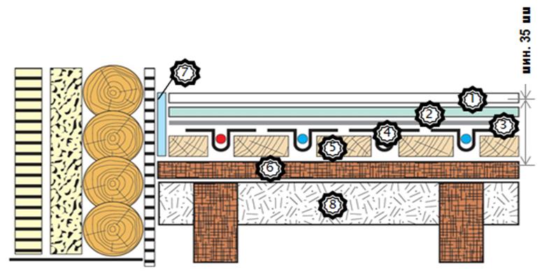 Между рейками необходимо оставлять зазор в 2 см для последующей укладки теплораспределительных пластин (поз. 4). Смысл использования этих пластин заложен в названии: распределение тепла в горизонтальном направлении, чтобы не было ощущения «полосатого» тепла на поверхности пола. Далее в пластины плотно защелкивается труба для водяного теплого пола и укладывается полиэтиленовая пленка (поз. 3), чтобы избежать шумовых эффектов, вследствие разного коэффициента линейного расширения используемых материалов. После чего укладываем один или два листа ГВЛ (гипсоволкнистый лист, поз. 2). Один – если в качестве финишного покрытия (поз. 1) используем ламинат, паркетную доску, линолеум и т.д., два листа в шахматном порядке – если укладываем керамическую плитку.