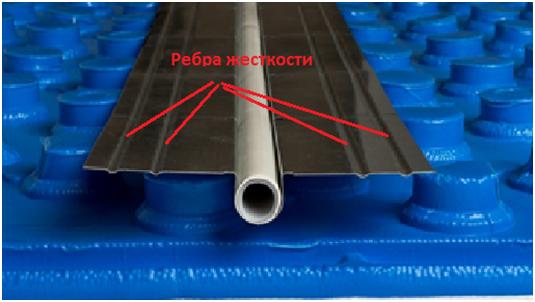 Компания VALTEC производит теплораспределительные пластины именно из оцинкованной стали (рис. 4). Это пластины метровой длины, важной особенностью которых является наличие ребер жесткости по краям. В случае отсутствия таких ребер (как на пластинах иных производителей) пластины придется прикручивать шурупами к деревянному полу, чтобы труба не скручивала их и не выдергивала из пазов.