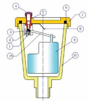 Традиционные автоматические воздухоотводчики имеют следующую конструкцию (рис. 5): латунный корпус 10, внутри которого свободноперемещается полый пластиковый поплавок 9. Поплавок шарнирно связан с коромыслом 15. На конце коромысла находится эластомерный золотник 3, фиксируемый обоймой 1, подпружиненной пружиной 2. При отсутствии воздуха в корпусе воздухоотводчика поплавок находится в крайнем верхнем положении, и золотник перекрывает отверстие воздушного штуцера 5.