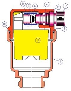 Воздухоотводчик VT.502 (рис. 6) состоит из двух латунных (CW617N) никелированных полукорпусов 1 и 2, соединенных между собою на резьбе суплотнительным кольцом из EPDM 10.Внутри корпуса свободно перемещается полипропиленовый поплавок 3, который своей скобой воздействует на держатель золотника 5, выполненный из нейлона. Золотник 6 с держателем 5 при помощи пружинной связи 7 (материал – нержавеющая сталь марки AISI306) связан с жиклером 4 (нейлон).При накоплении воздуха или газа в верхней части полукорпуса 2 поплавок 3 опускается, воздействуя на держатель 5. При этом золотник 6 открывает калиброванное (1,5 мм) отверстие жиклера 4. Благодаря избыточному давлению транспортируемой среды воздух или другие газы, скопившиеся в верхней части воздухоотводчика, удаляются наружу по каналу жиклера 4. Пробка 9 при поставке находится в закрытомположении, чтобы пыль и грязь не могли проникнуть в корпус. Уплотнительное кольцо на присоединительном патрубке позволяет монтировать воздухоотводчик без дополнительных герметизирующих материалов.