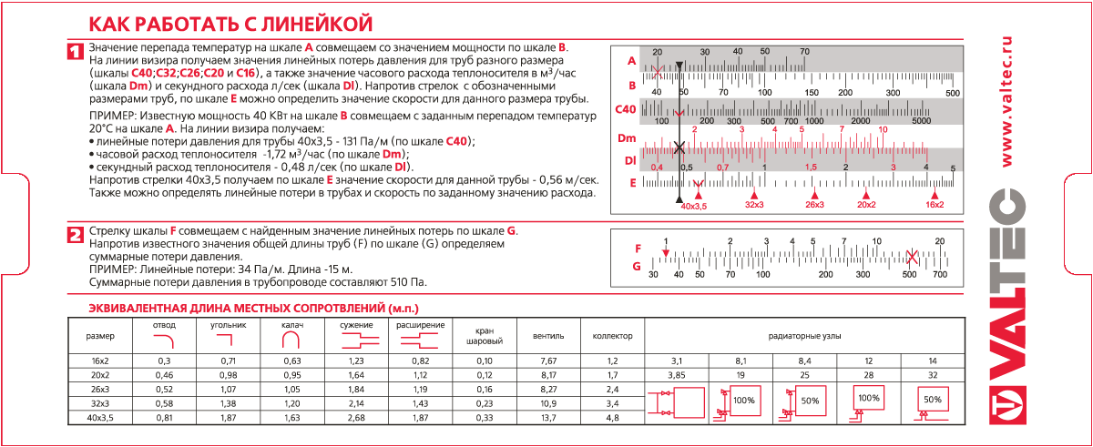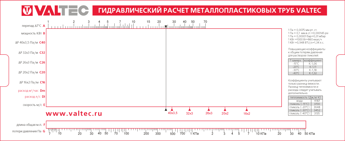 Линейка предназначена для оперативного прикидочного гидравлического расчета металлопластиковых трубопроводов.
