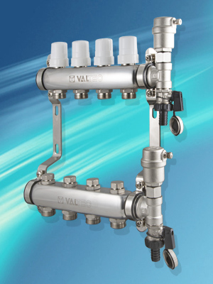 Количество выходов коллекторов – от 3 до 10, рабочее давление – 9 бар, максимальная рабочая температура – 90 °С. Материал коллекторов – нержавеющая сталь AISI 301, фитингов, деталей термоклапанов, корпусов воздухоотводчиков – горячештампованная латунь CW617N, уплотнительных колец и золотниковых прокладок клапанов – EPDM 70Sh.