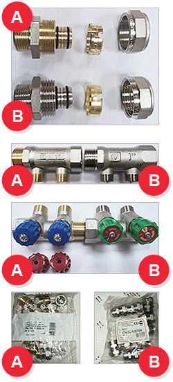Коллекторы нового типа (на фото – А) не имеют никелевого покрытия на резьбовых и внутренних частях, но укомплектованы ручками двух цветов – синего и красного. К этому виду в дальнейшем планируется постепенно привести внешний вид всех коллекторов VALTEC.