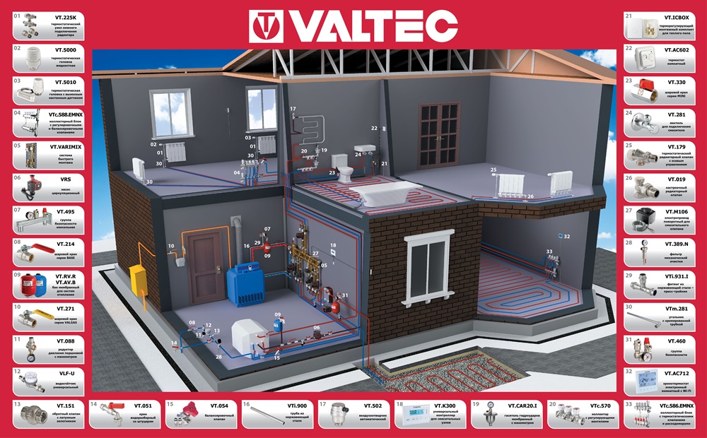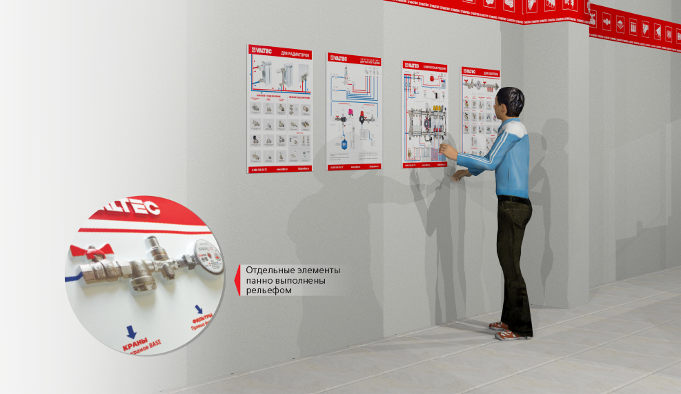 Новые рельефные панно со схемами демонстрируют комплексные решения инженерной сантехники VALTEC: отопление для квартиры, водоснабжение для квартиры, а также отопление и водоснабжение для частного дома. Рекомендуем в магазине размещать панно всех четырех видов.