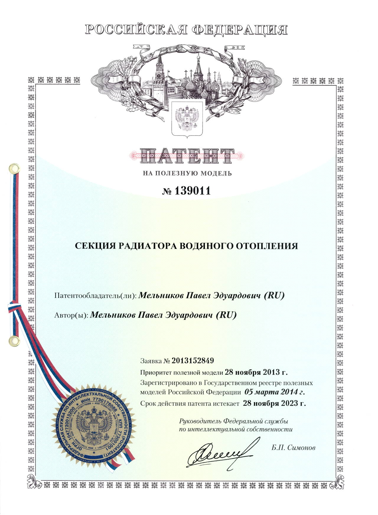 Патент № 139011. Автор: Мельников Павел Эдуардович